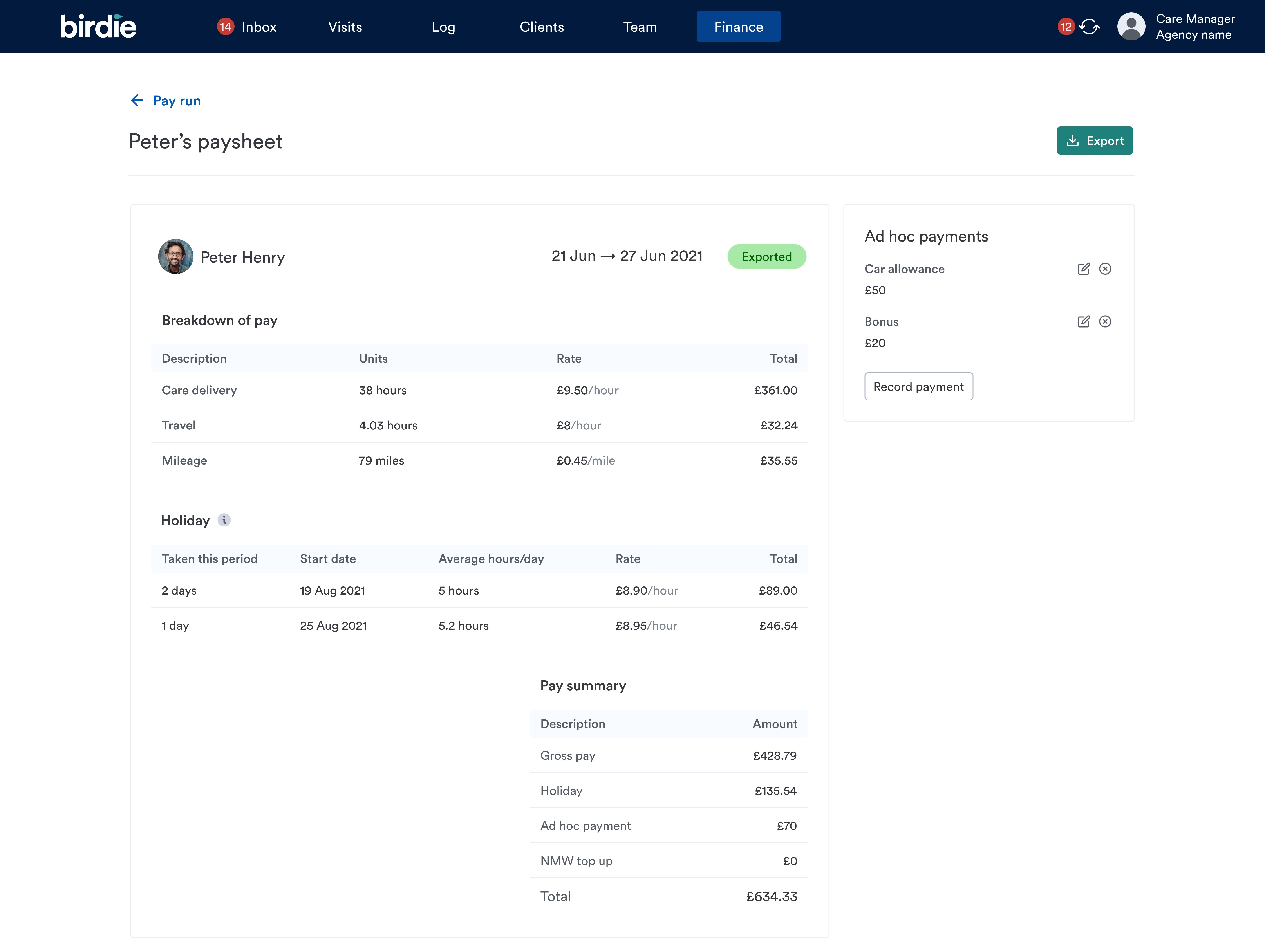 Created transparent workflows for reviewing visit data, adjusting paid time, and generating pay sheets with confidence